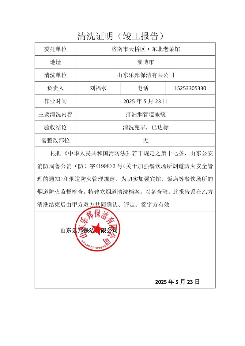濟(jì)南市天橋區(qū)·東北老菜館清洗報告25.5.23